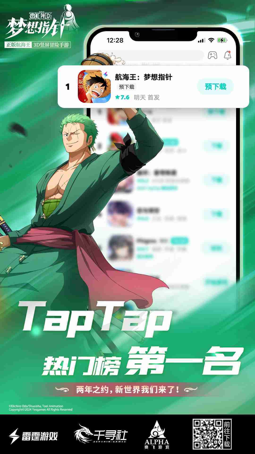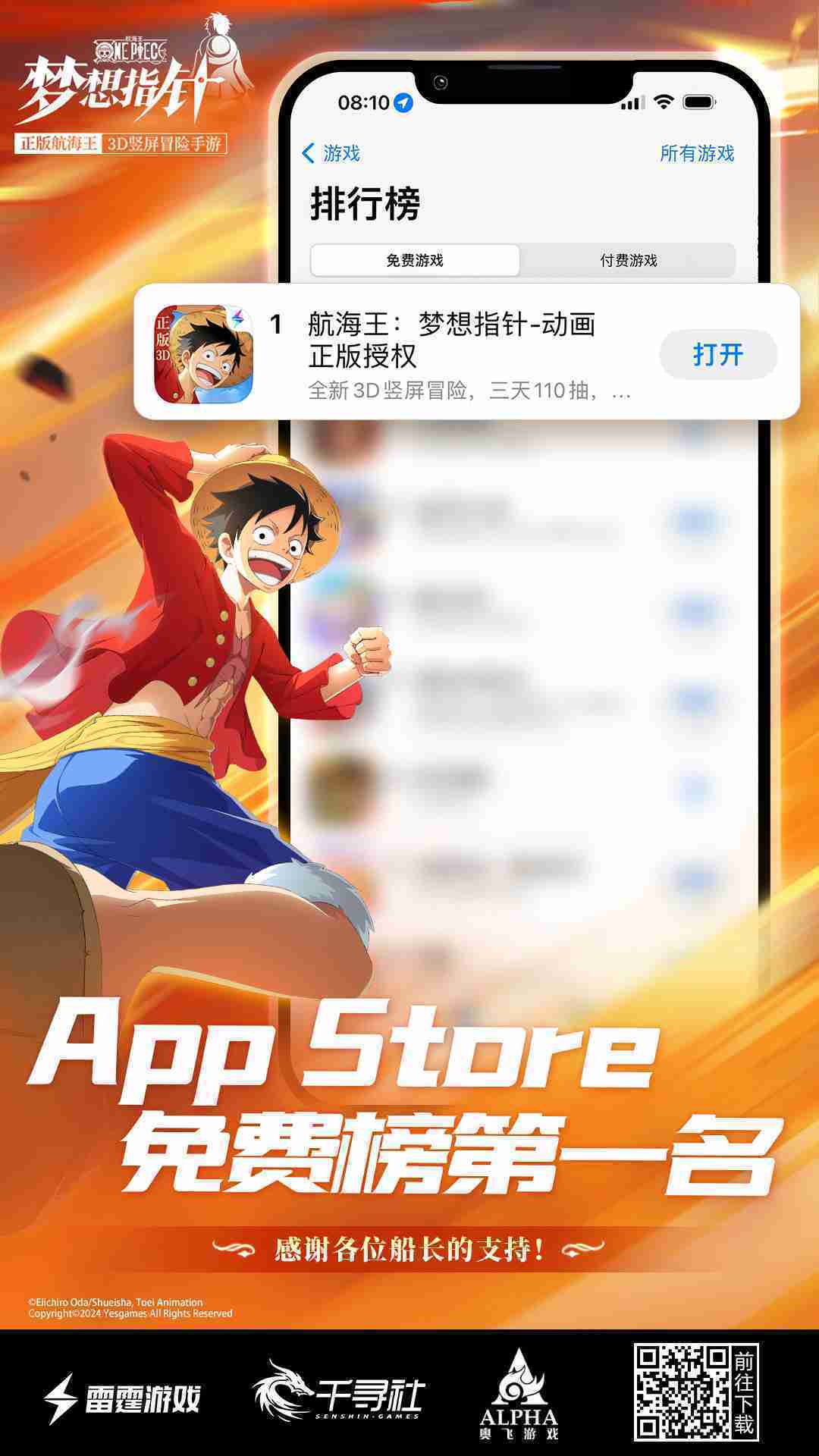 4月1日,,,,手游《航海王::梦想指针》正式公测,,上线仅2小时不到就登上了App Store免费榜Top1,,,与TapTap热门榜第一。。。。